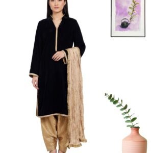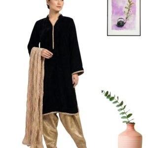 Elegant Noir: Velvet Shirt with Golden Shalwar and Crushed Dupatta-Stitched 3PC