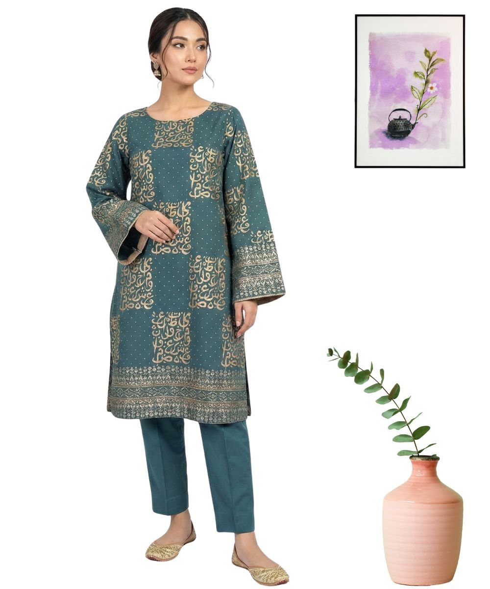 Adorned with intricate Urdu calligraphy, our shirt is a work of art. Each letter is meticulously hand block printed by skilled artisans, creating a mesmerizing tapestry of script and design. The hand block print technique lends a unique and authentic touch to the shirt. Unique combination of gold and silver, the natural variations in the print add depth and character, making each piece one-of-a-kind. Complementing the intricate print of the shirt is a classic plain trouser in a neutral tone. The clean lines and tailored fit provide a perfect balance to the artistic flair of the shirt, allowing it to shine. The handcrafted nature of the print pays homage to centuries-old traditions, making it perfect for cultural events and art exhibitions.