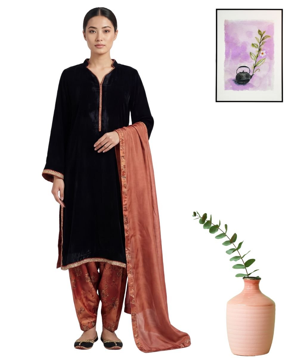 Black Velvet Shirt With Silk Shalwar & Dupatta (Shawl)-Stitched 3PC