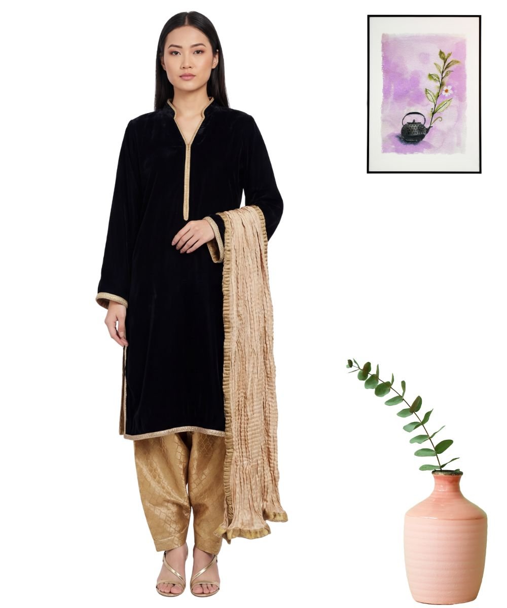 Elegant Noir: Velvet Shirt with Golden Shalwar and Crushed Dupatta-Stitched 3PC
