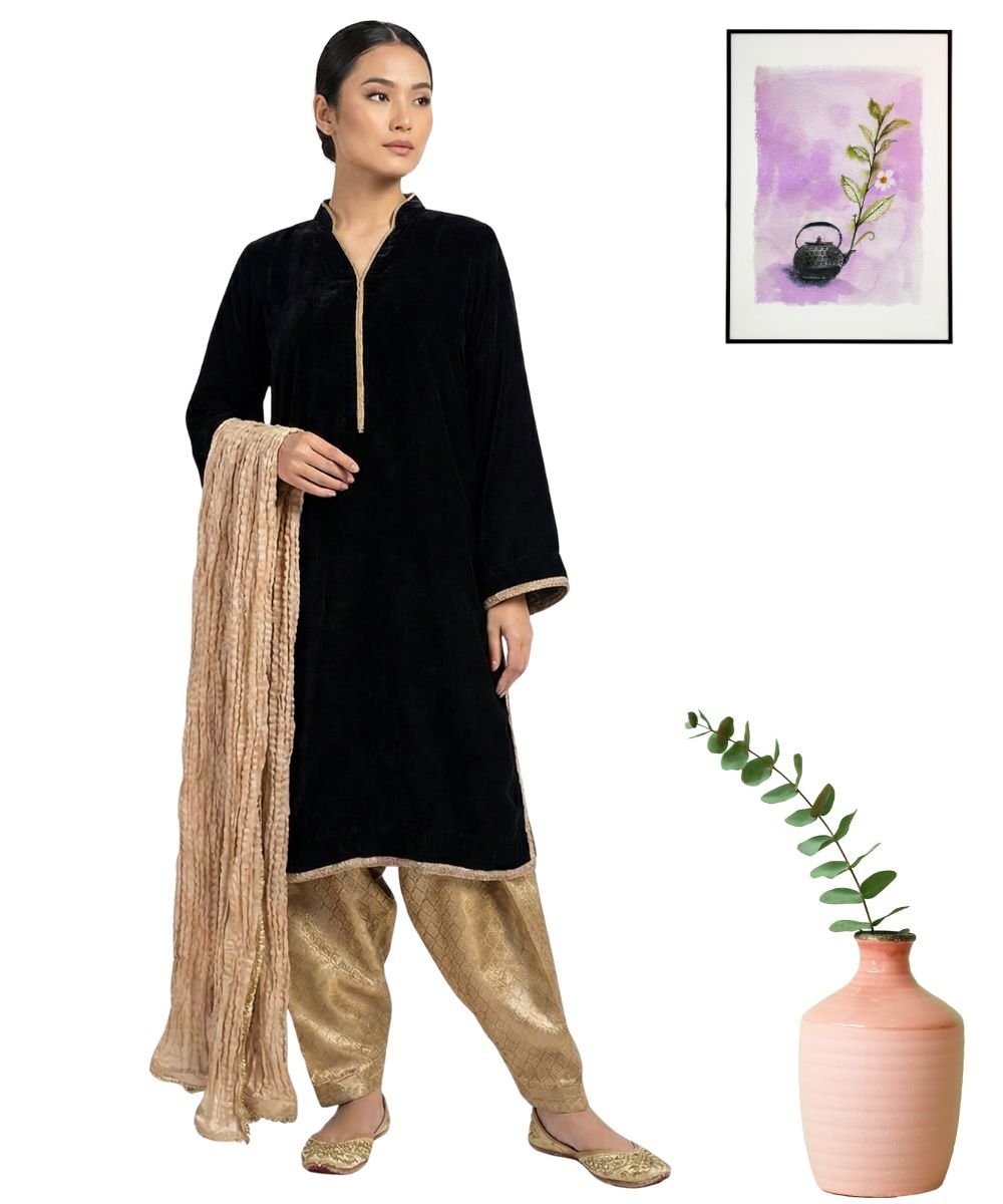 Be the first to review “Elegant Noir: Velvet Shirt with Golden Shalwar and Crushed Dupatta-Stitched 3PC ”