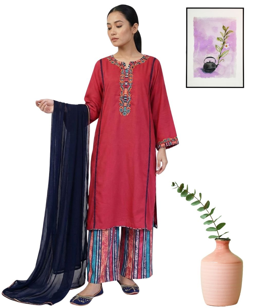 Crafted in a bold shade of red, the shirt is adorned with intricate embroidery that dances across the fabric. The vibrant hues and intricate patterns create a stunning visual display, drawing admiration with every step. The shirt is embellished with delicate embroidery in contrasting colors, adding depth and richness to the design. Intricate floral patterns & matching lace come together in a harmonious blend of traditional and contemporary styles. The multi-color line pattern on the trouser features a spectrum of hues, from bright reds to deep blues, creating a lively and festive look. Each color tells a story of celebration and joy. Plain dupatta with delicate colorful machine embroidery lace on all sides adds a stunning look to the dress.