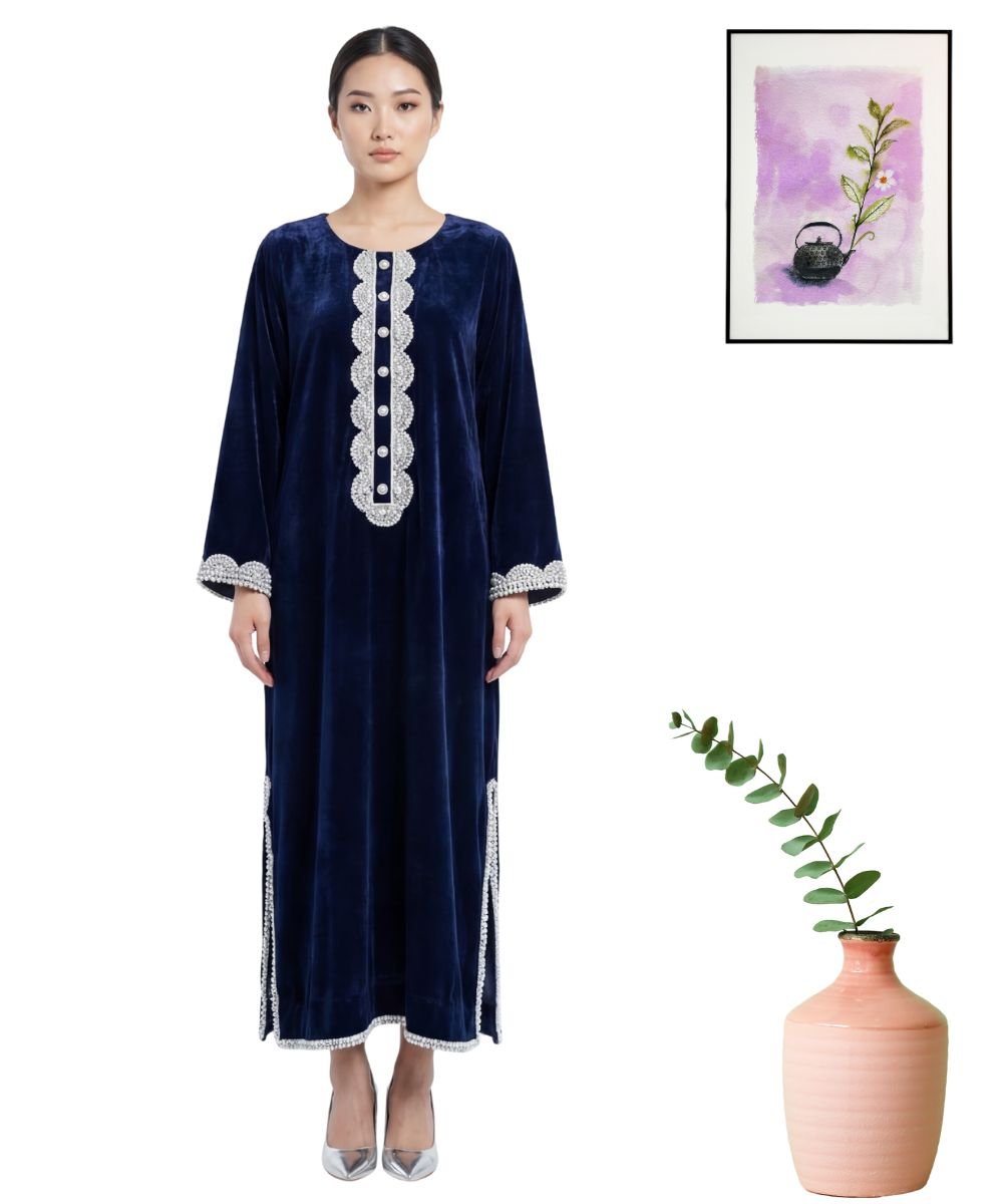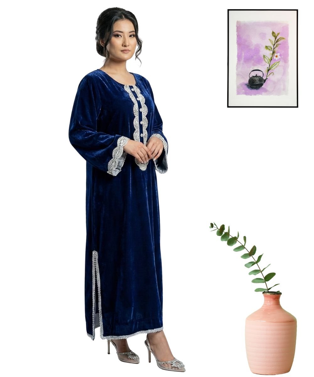 Crafted from sumptuous dark blue velvet, this long shirt drapes elegantly with a loose, straight fit. Admire the intricate detailing of pearl fancy lace that adorns the neckline, sleeves, hem, and daaman of the shirt. The sleeves of the shirt are adorned with cascading pearl fancy lace, creating a statement of elegance with every movement. Paired with a plain Indian raw silk trouser, this ensemble offers a harmonious balance of textures and finishes.