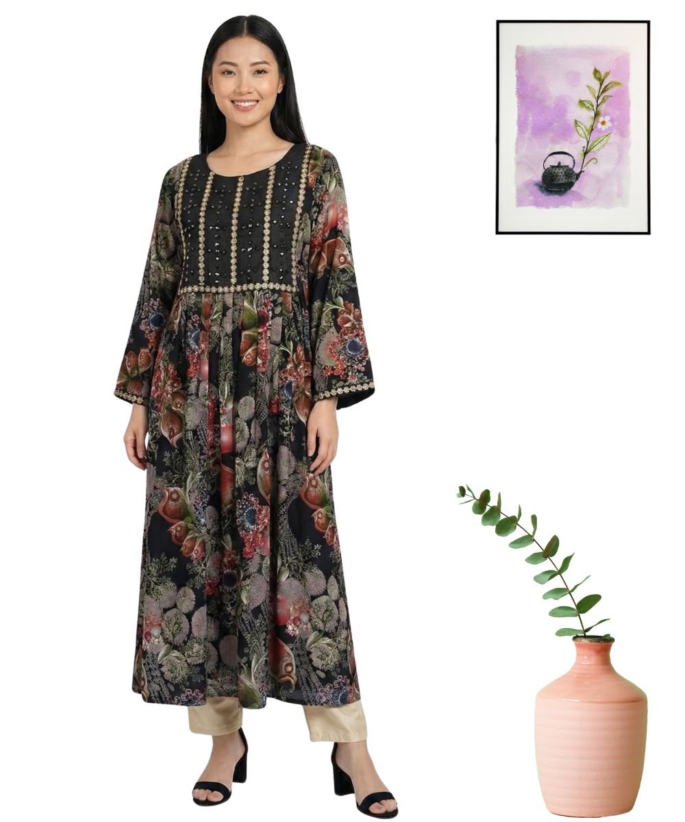 Crafted from sumptuous dark blue printed marina fabric, adorning the front of the dress, the mirror work creates a dazzling display of light and reflection. Each mirror is meticulously placed, adding a regal touch to the ensemble. The bodice of the dress is graced with delicate antique-style lace, both at the front and back. This vintage-inspired lace adds an air of romance and sophistication to the dress, making it a true statement piece. Elevate your style with the bell-shaped full sleeves of the dress, adorned with lace at the edges. These sleeves add a touch of elegance, enhancing the overall allure of the ensemble. The combination of mirror work, antique lace, and bell sleeves creates a look that is both stylish and versatile. Completing the ensemble is a classic plain trouser in a complementary color. The simplicity of the trouser allows the dress to shine, creating a harmonious and balanced look. Whether worn at a cultural celebration or a fashionable event, this dress is sure to make a statement. Whether you’re celebrating a special occasion or simply stepping out in style, this dress promises to make you feel like royalty.